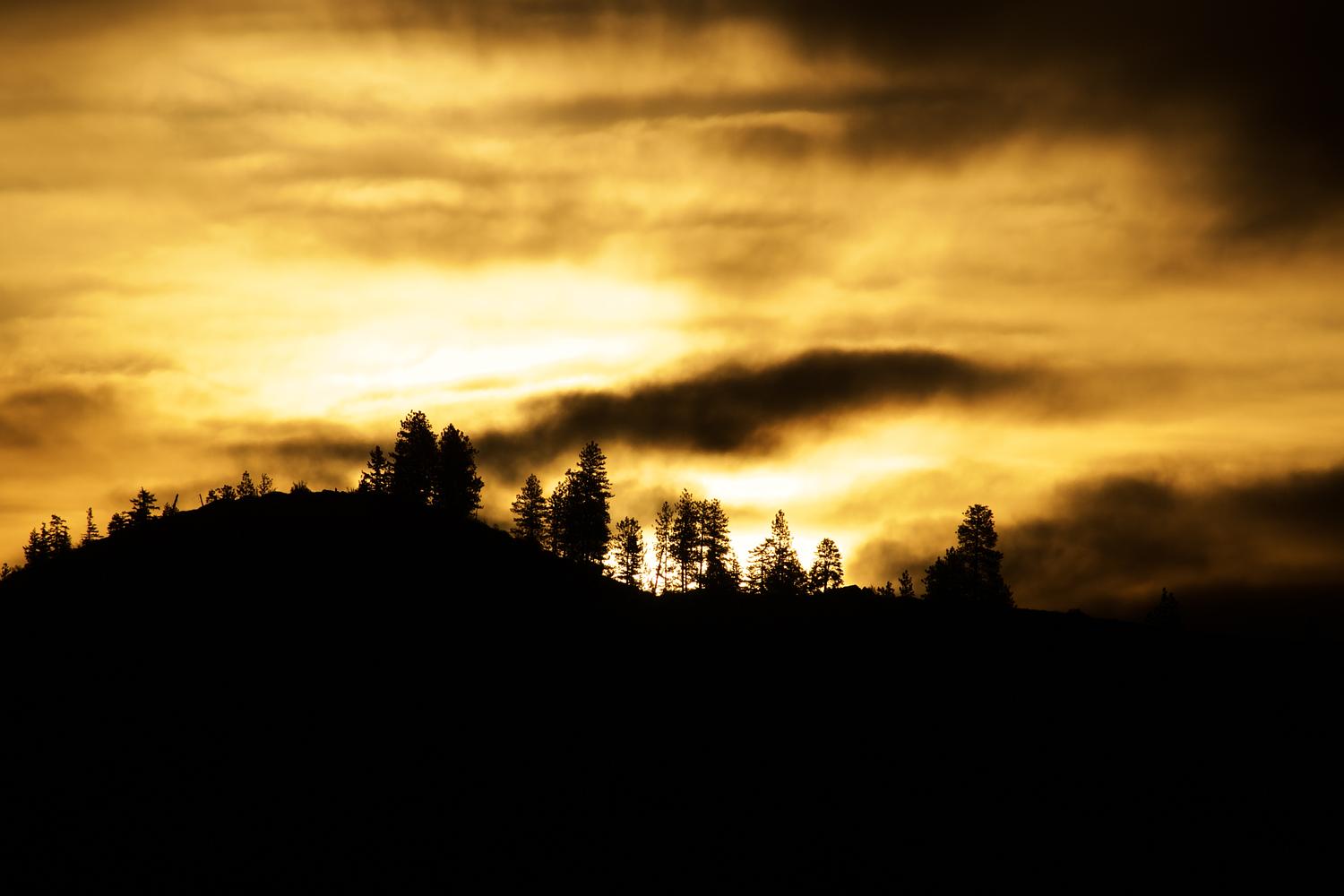 Atop the mountain's embrace, a breathtaking spectacle unfolds as the silhouettes of trees stand tall against the canvas of a vibrant sunrise. The warm hues of orange and gold paint the sky, casting a radiant glow that backlights the majestic trees.