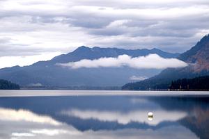A serene lake reflects the tranquility of a calm morning, its still waters leading the gaze towards majestic mountains in the distance. The mirrored surface gently holds the image of a lone buoy, standing sentinel amidst the peaceful expanse. Above, a white, fluffy cloud graces the clear blue sky, casting its ethereal reflection on the pristine lake. This harmonious scene captures the essence of quietude and natural beauty, inviting contemplation and a sense of serenity.