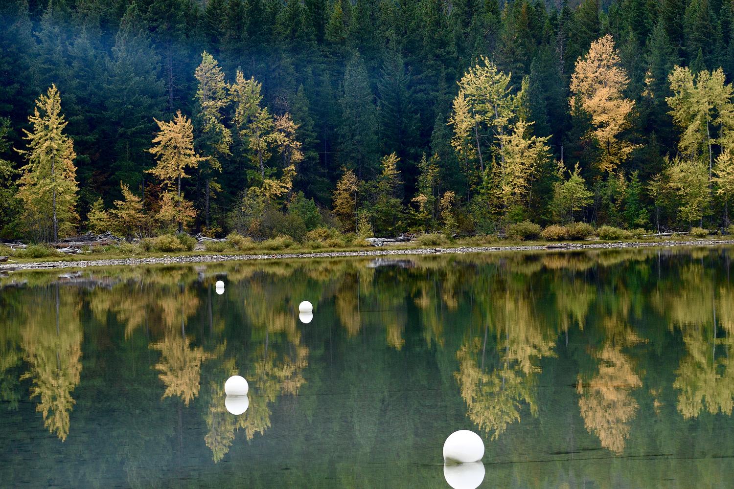 Calm waters become a canvas for nature's palette as four buoys gently float, mirroring the vibrant symphony of yellows, greens, and blues from the surrounding trees and sky.
