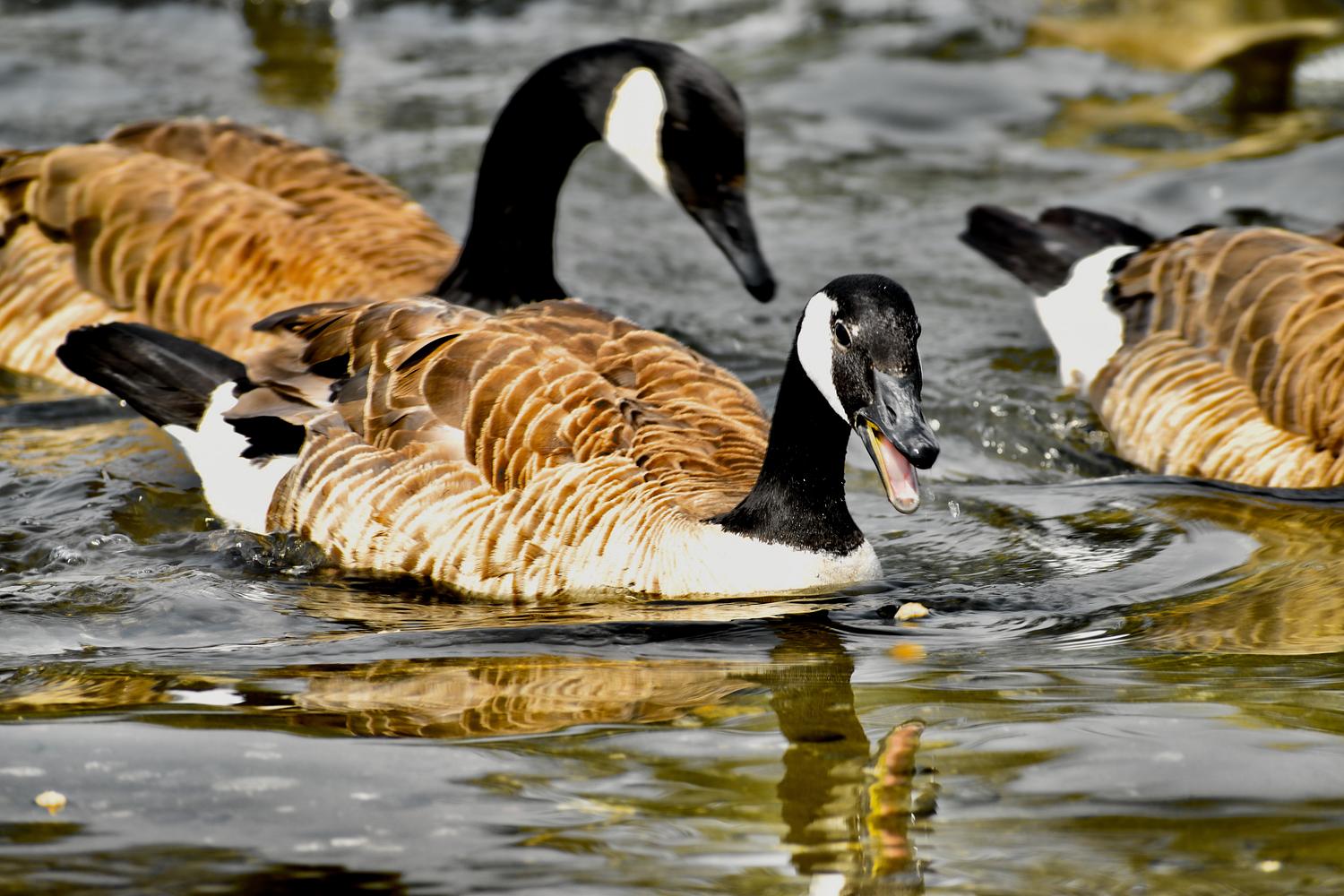 A trio of geese gracefully glides across the water, their serene presence filling the frame. In this tranquil scene, the main goose gazes at its own reflection, creating a moment of introspection amidst the gentle ripples.