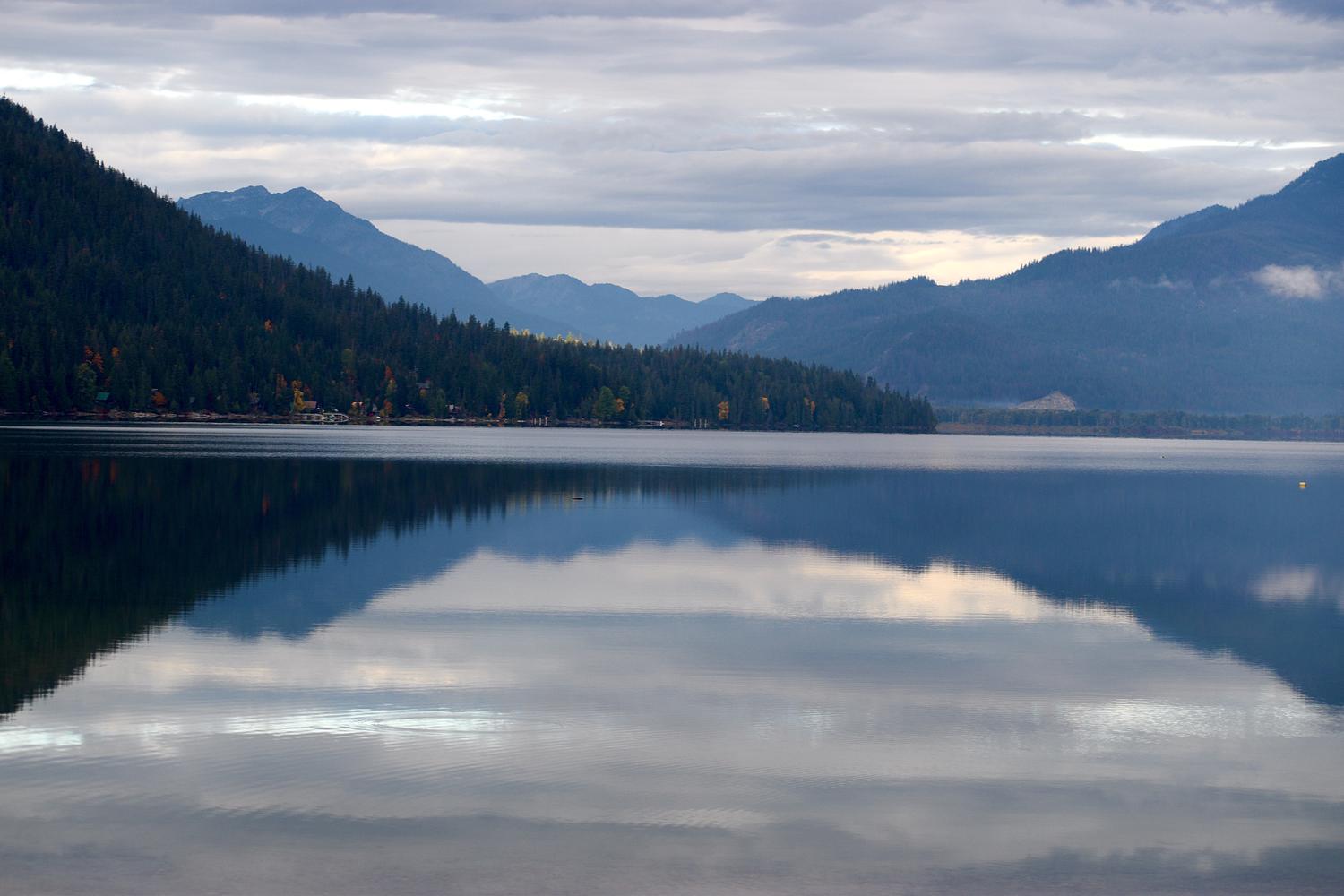 A breathtaking tableau unfolds along the lake, where a tree line, adorned with the vibrant hues of autumn, leads the gaze towards majestic mountains. Scattered trees, touched by the hand of fall, showcase a symphony of reds and golds amidst the evergreen backdrop. The calm waters mirror this picturesque scene, capturing the reflection of the tree line and mountains, creating a mesmerizing composition that celebrates the beauty of nature's seasonal transition.