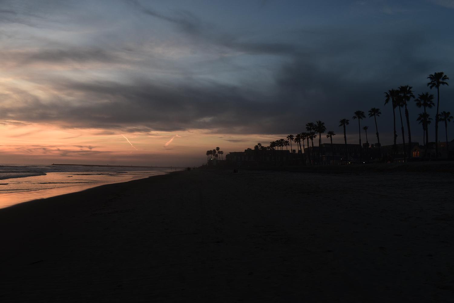 As the sun dips below the horizon, a serene coastal scene unfolds. To the left, the tranquil ocean reflects the soft hues of the twilight sky, while to the right, palm trees sway gently in the evening breeze and beach houses nestle along the shore.