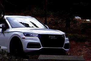 This photo showcases a pristine Audi surrounded by foliage and offers a close up view of its white polished exterior.